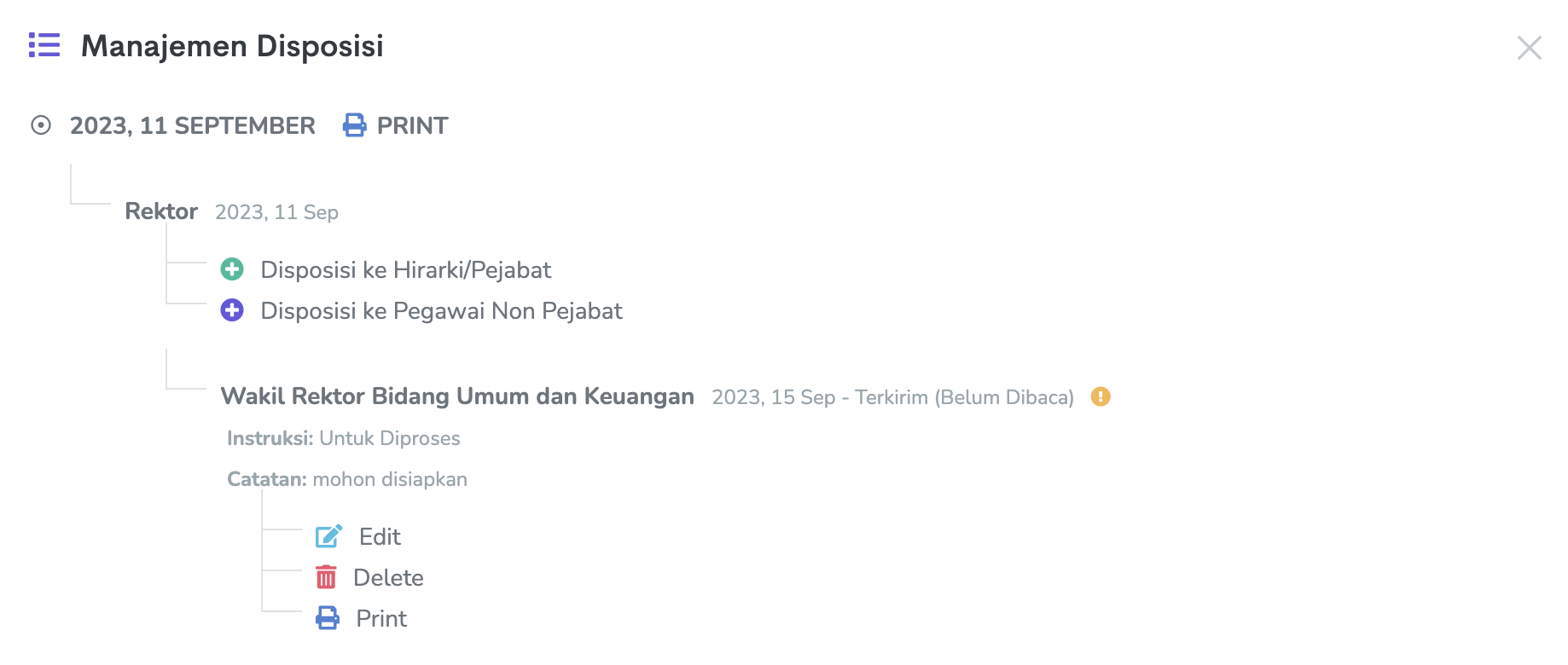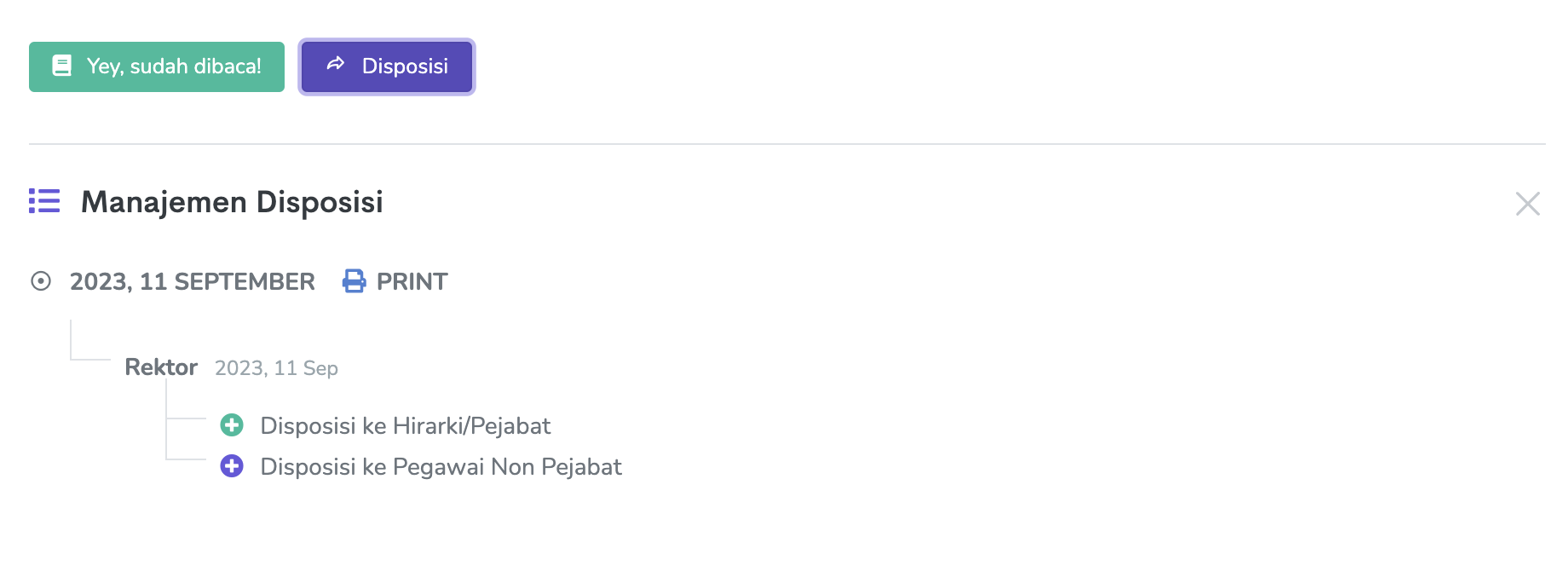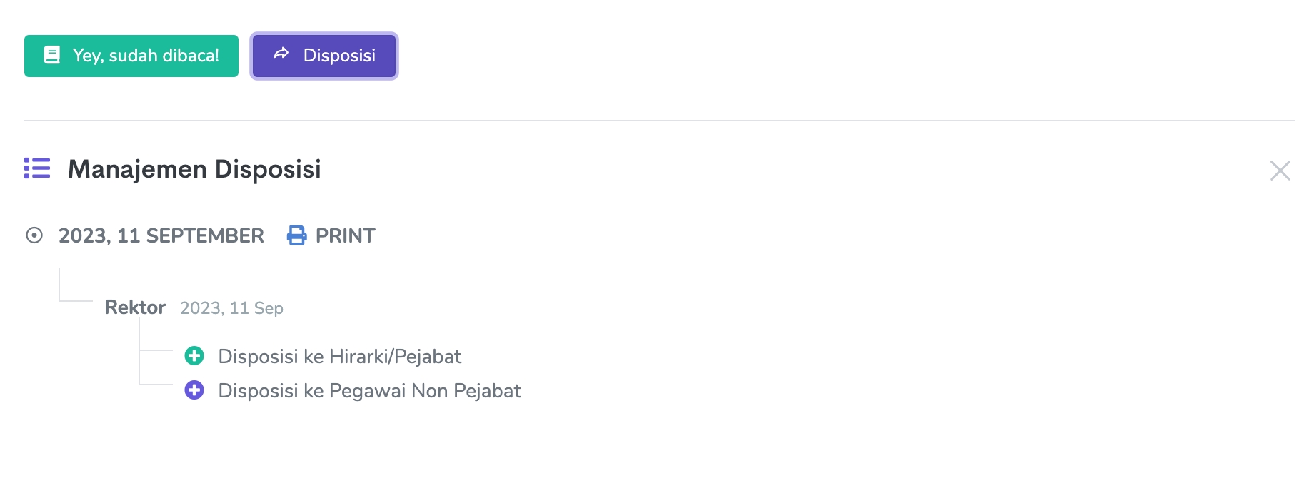 Pengguna yang menerima disposisi dapat melanjutkan disposisi ke hirarki atau pegawai berikutnya atau menandai bahwa disposisi tersebut telah ditindaklanjuti dengan klik tombol Response.