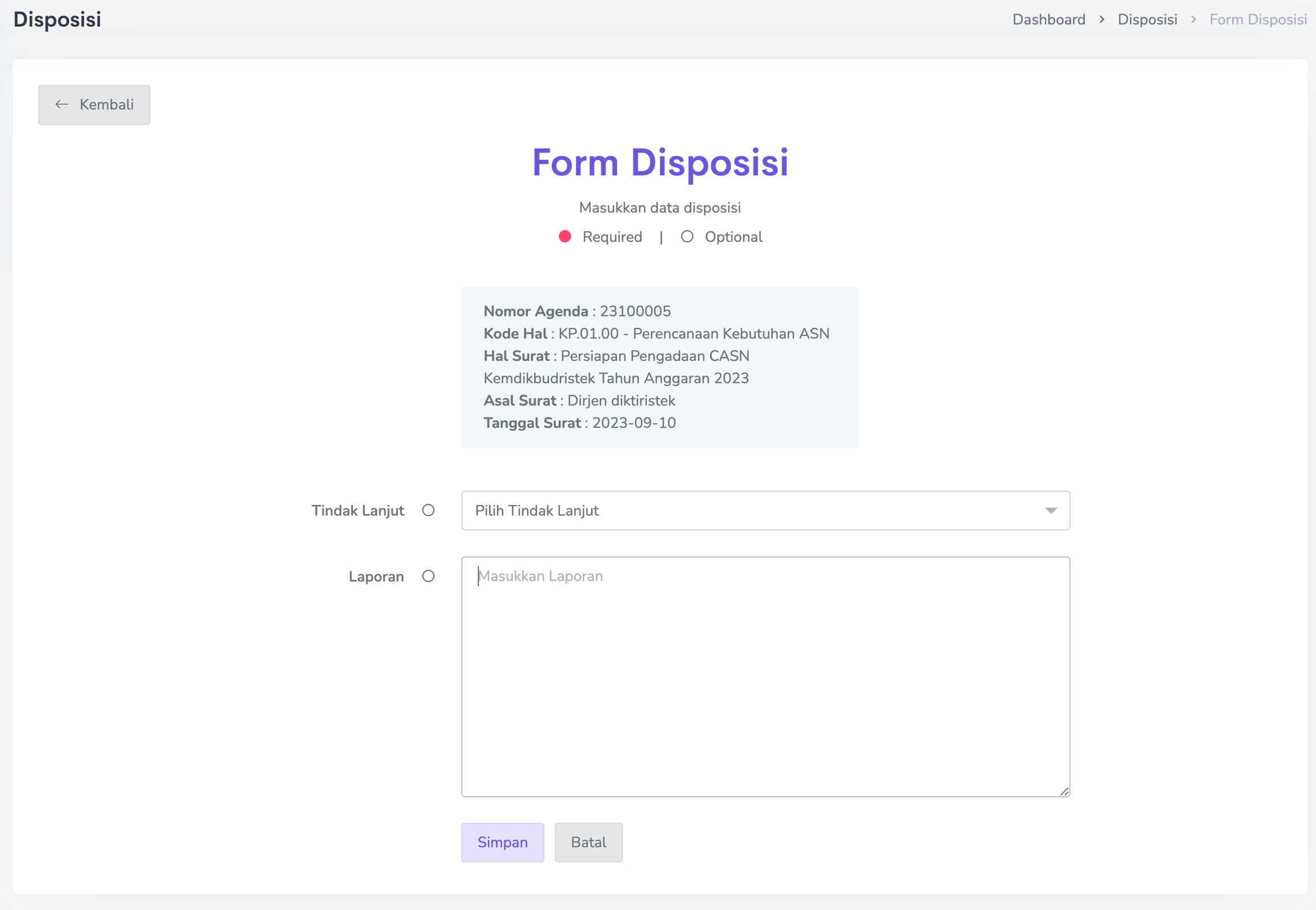Tanggal Disposisi (wajib diisi), isikan tanggal dilakukan disposisi.