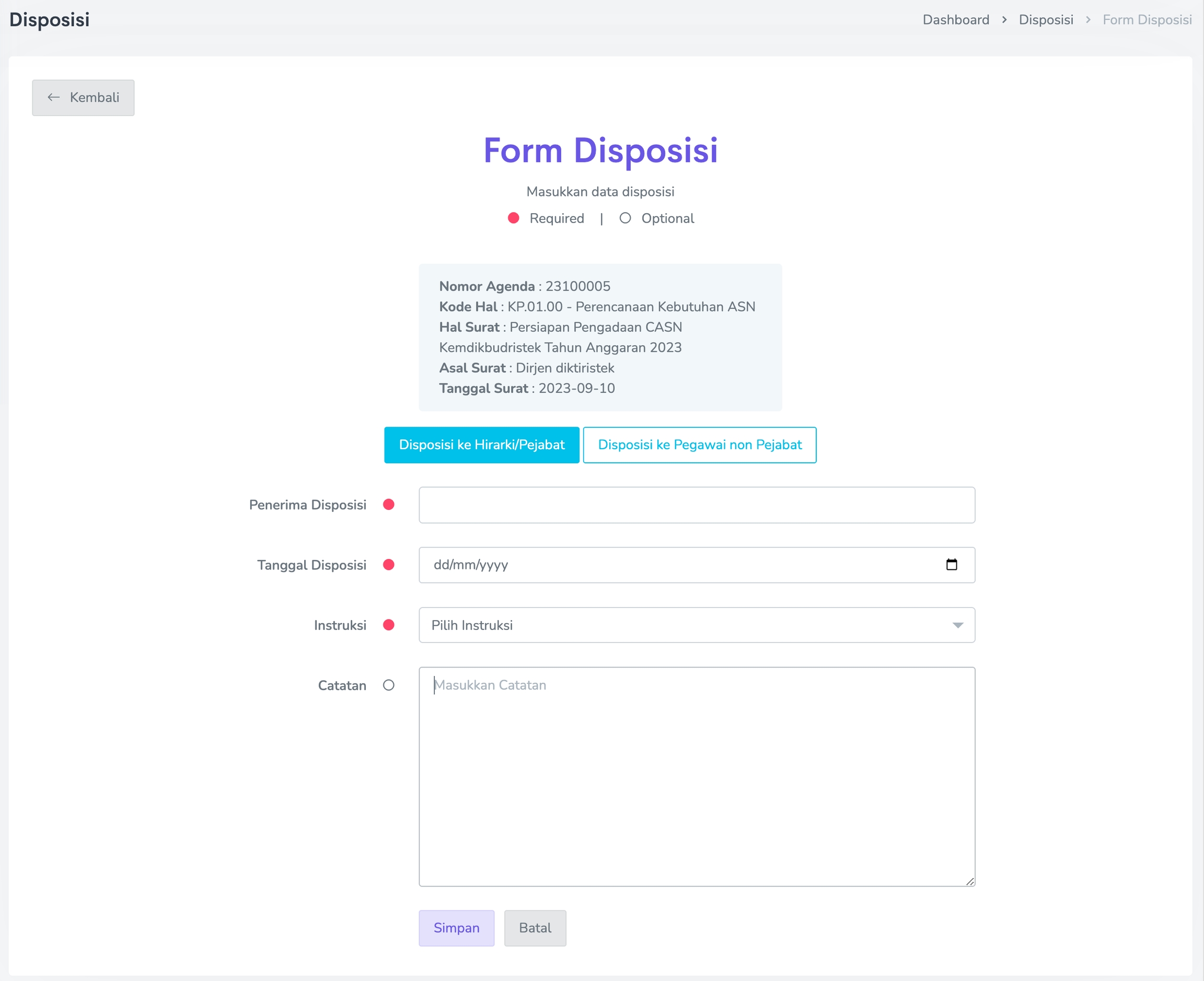 Catatan (tidak wajib diisi), isikan catatan atau detail instruksi disposisi.