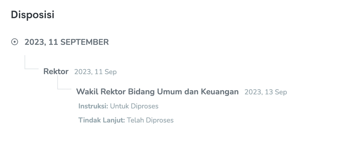 Untuk melihat posisi surat dapat dilihat pada bagian bawah dengan cara gulir jendela sampai ditemukan bagian Disposisi sebagai berikut: