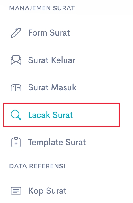 Surat yang sudah masuk dapat dilacak untuk mengetahui posisi terakhir surat tersebut dengan cara klik pada menu Lacak Surat pada kategori menu Manajemen Surat.