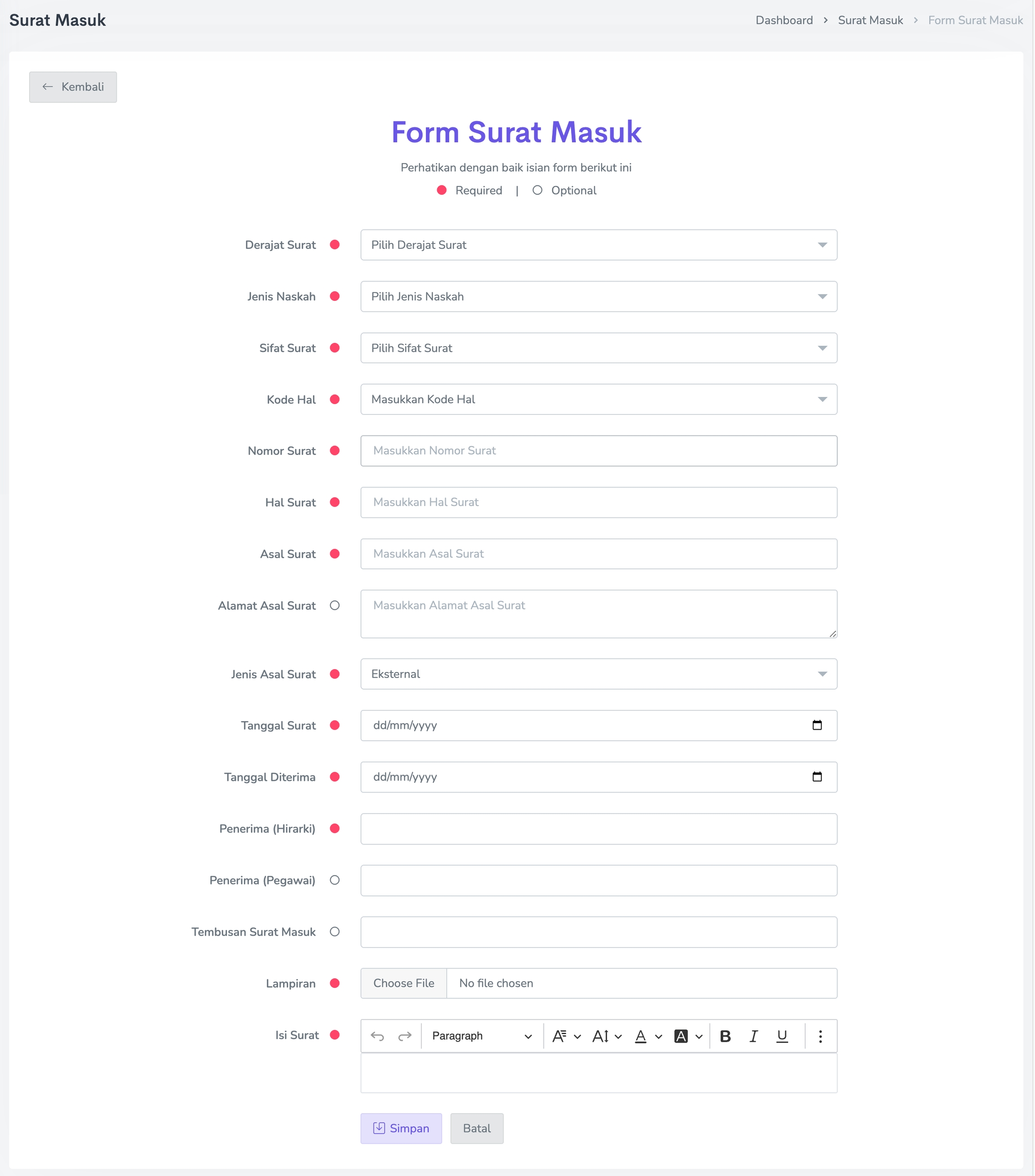 Derajat Surat (wajib diisi), pilih tingkat urgensi surat yang diterima (Biasa, Segera atau Sangat Segera).