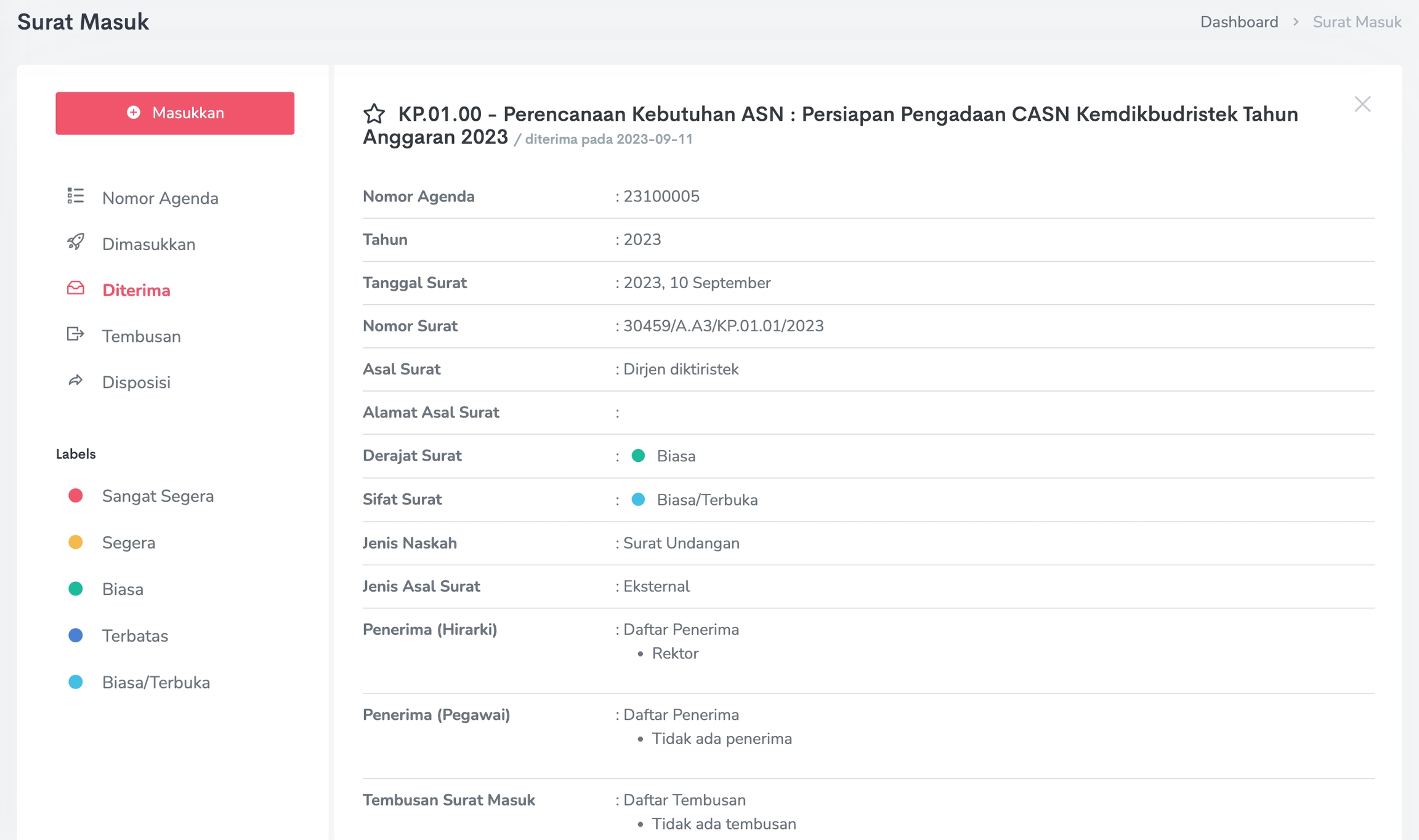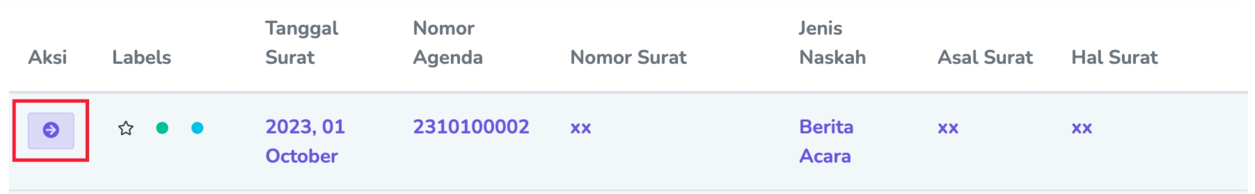 Sedangkan untuk melihat detail surat yang masuk, klik tombol panah pada kolom aksi