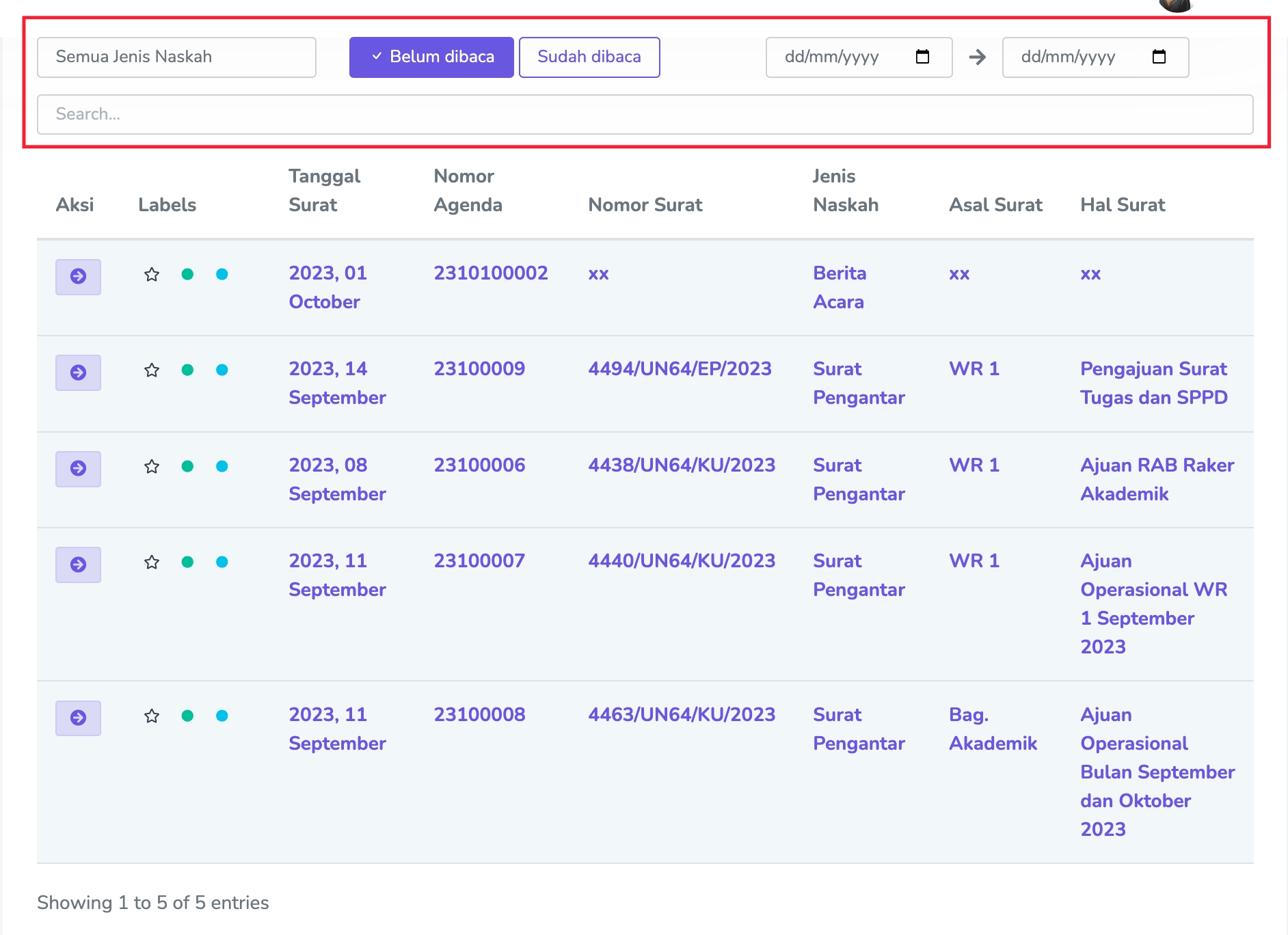 Surat yang masuk dapat difilter berdasarkan Jenis Naskah, Status Surat (Belum dibaca atau Sudah dibaca), tanggal diterima atau berdasarkan kata kunci periha/isi surat.
