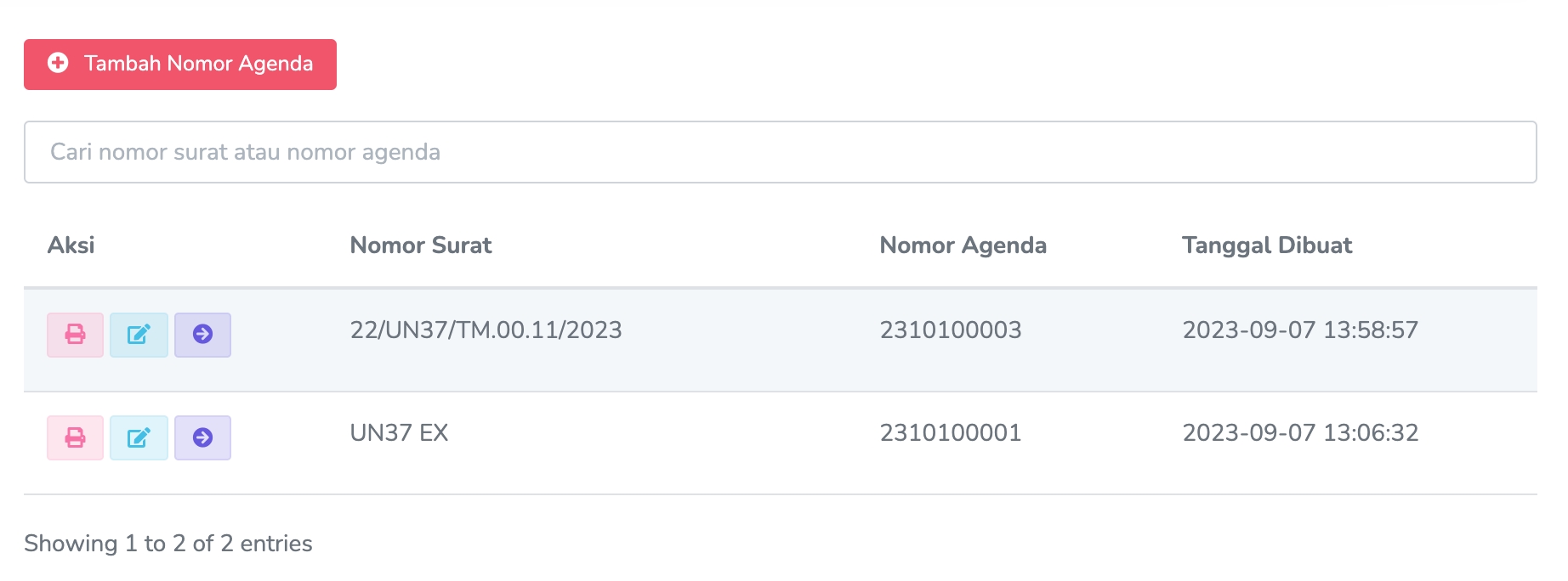 Selain melalui tombol Masukkan seperti pada langkah Registrasi Surat Masuk, pada dashboard surat masuk juga terdapat opsi Tambah Nomor Agenda. Opsi ini digunakan apabila dalam kondisi mendesak kurir pengantar surat harus segera meninggalkan tempat sehingga dibuatkan nomor agenda terlebih dahulu sebagai tanda bukti terima surat.