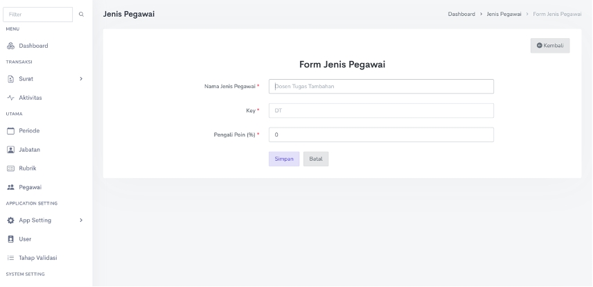 Isikan form Jenis Pegawai pada halaman Form Jenis Pegawai untuk menambah data Jenis Pegawai baru. Ketika sudah selesai mengisi semua form, klik tombol Simpan untuk proses menyimpan data.