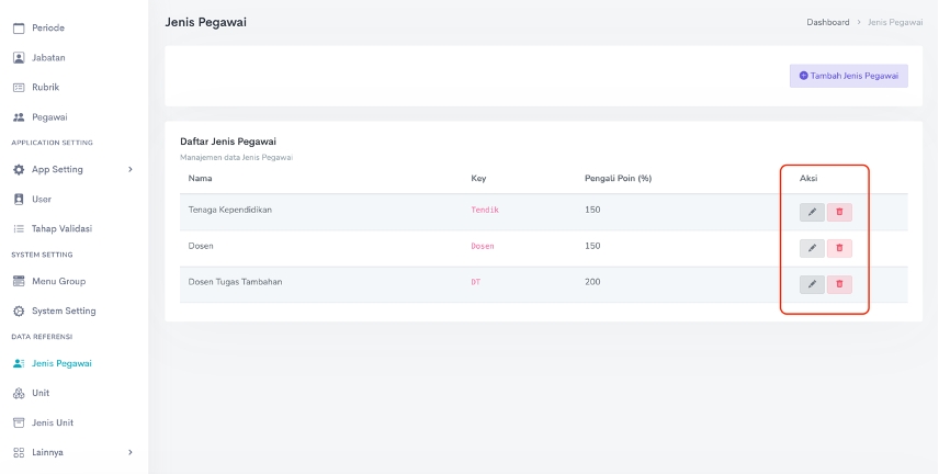 Untuk mengubah data referensi Jenis Pegawai, dapat dilakukan dengam menekan tombol edit (ikon pensil), dan untuk menghapus data Jenis Pegawai yang sudah ada, bisa menekan tombol hapus (ikon trash) pada tabel data Jenis Pegawai di kolom Aksi, seperti yang ditunjukkan pada gambar berikut: