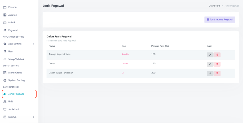 Data referensi jenis pegawai digunakan untuk mengatur klasifikasi pegawai untuk pembeda perhitungan remun yang berlaku, misalnya dalam suatu kegiatan atau aktivitas, perolehan poin untuk Dosen dengan tugas tambahan lebih besar nilainya dibandingkan dengan Dosen tanpa tugas tambahan. Tidak hanya itu, menu ini juga dapat digunakan sebagai pembatas maksimum poin yang dapat diperoleh untuk setiap jenis pegawai.
