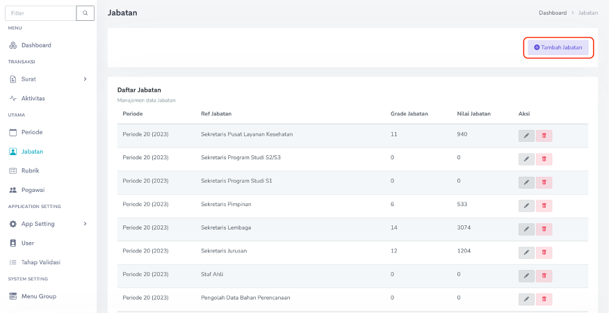 Tampilan pada menu Jabatan dapat dilihat pada gambar di bawah ini: