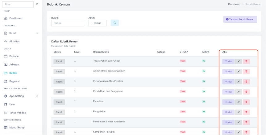 Untuk mengubah data Rubrik remunerasi, dapat dilakukan dengam menekan tombol edit (ikon pensil), dan untuk menghapus data yang sudah ada, bisa menekan tombol hapus (ikon trash) pada tabel data Rubrik pada kolom Aksi, seperti yang ditunjukkan pada gambar berikut: