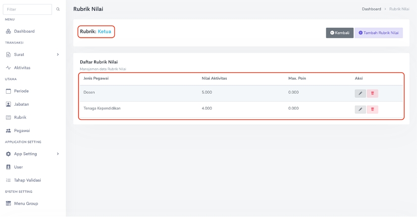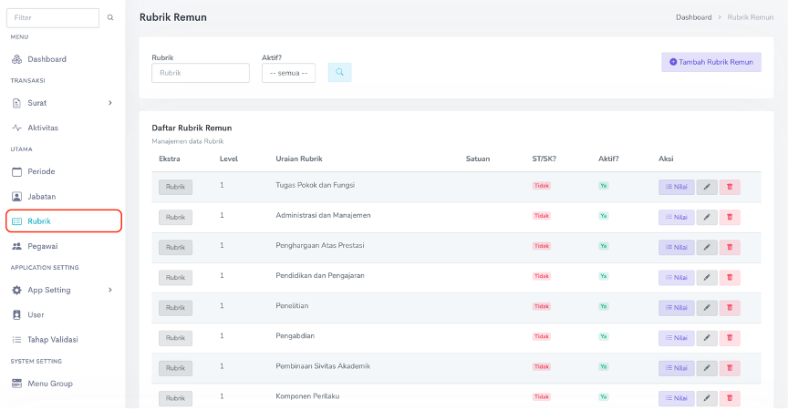 Data Rubrik digunakan untuk mengelola data Rubrik remunerasi, beserta nilai aktivitas (poin) yang akan didapat ketika seorang pegawai mendapat pekerjaan terkait dengan rubrik tersebut. Data Rubrik ini menggunakan basis periode, sehingga apabila terdapat perubahan data pada periode tertentu, tidak akan mengubah data Rubrik pada periode lain.
